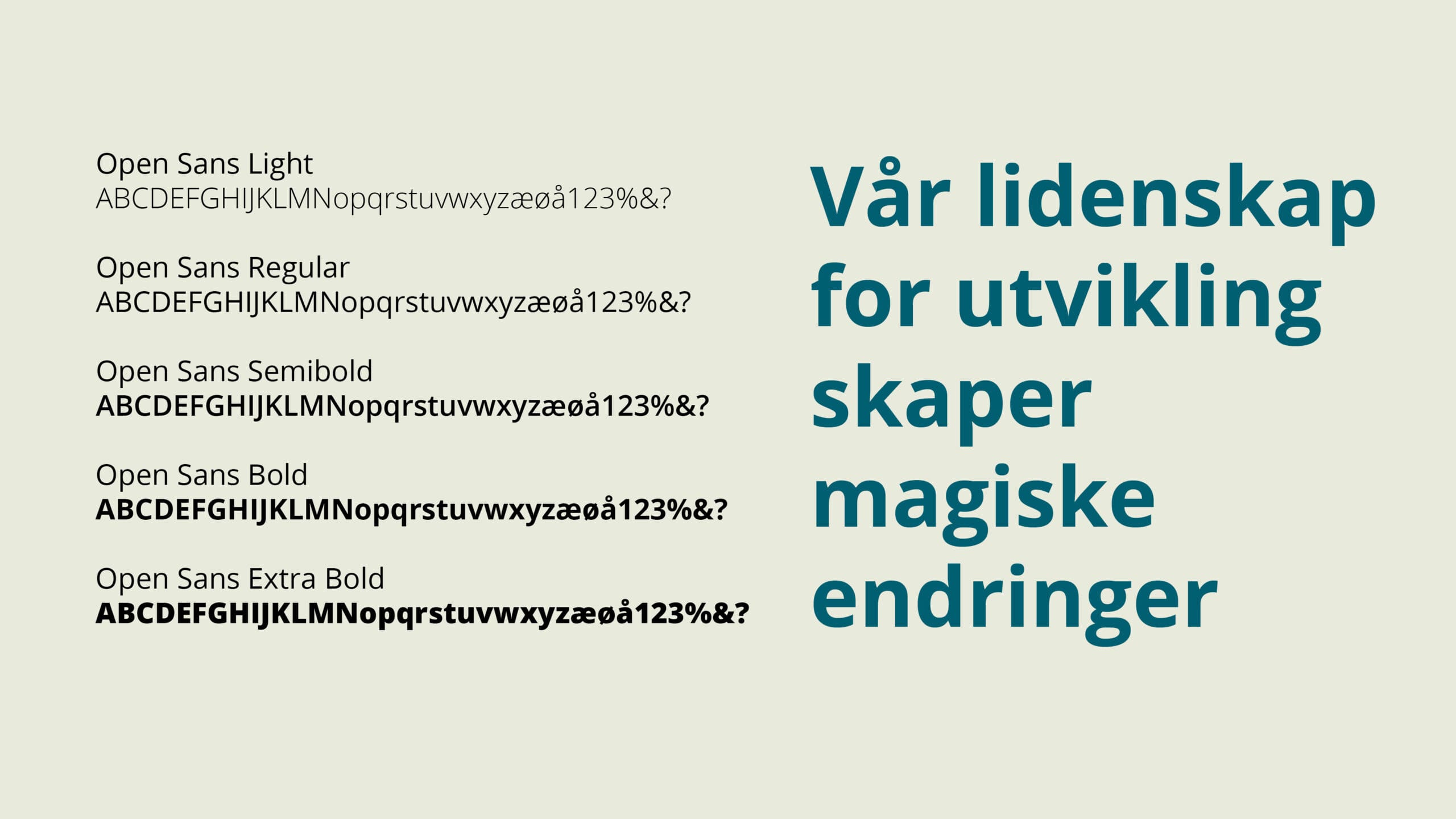 Skriftfamilien Open Sans brukes på alle tittelnivåer og brødtekst, på digitale flater og i trykk.